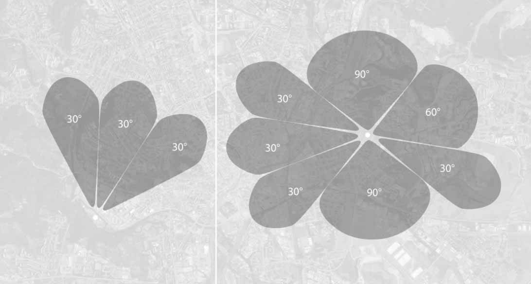 Simetrik Horn Sektör antenler, ortak nokta planlama altyapısına ölçeklendirilebilir bir planlama imkânı sunarak altyapı planlama standartlarını yeniden tanımlamaktadır. 30° den 90° Aralığa kadar uzanan geniş bir yelpazede sunulan RF Elements Simetrik Horn antenler standart ağ tasarımlarının zorunluluklarını ortadan kaldırıyor. Ayrıca benzersiz RF ışınımı ve ortak alan kullanım senaryolarında sağladığı izolasyon ve eksiksiz kapsama alanı ile geleneksel sektör antenlere göre daha fazla verim sağlamaktadır. Ortak alan planlamasında sol üst resimde de görüleceği üzere sektör antenin baktığı cephenin ihtiyaçlarını karşılayacak asimetrik kapsama alanı oluşturmak için geniş çeşitlilik sunan Simetrikal Horn Antenler kurulan yayın noktası üzerinde daha az yer işgal etmektedir.