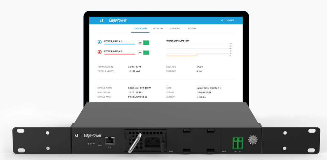 UBNT EdgePower EP‑54V‑150W, UBNT EdgePower Güç Kaynağı, 2 adet DC modüler bağlantı portu ile sağlanan gücü ikiye katlamak veya yedekli bir besleme altyapısı kurmak için modüler olarak tasarlanmıştır. Dahili web arayüzü ile Cihaz sıcaklığı, anlık ve toplam güç tüketimi yerel ağ veya uzaktan kolaylıkla takip edilebilmektedir.