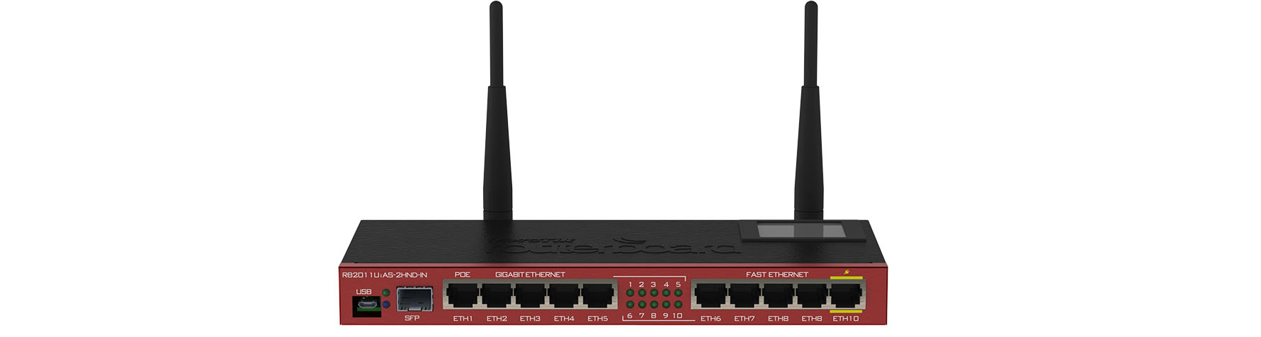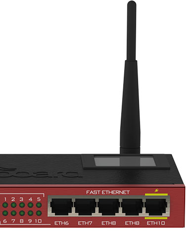 2.4GHz AP, 5x Ethernet, 5x Gigabit Ethernet, SFP cage, USB, LCD, PoE output on Eth10, 600MHz CPU, 128MB RAM