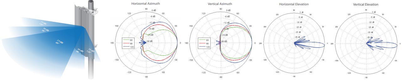 Açıya Göre Anten Kazancı 17 dBi @ 60° | 16 dBi @ 90° | 15 dBi @ 120°